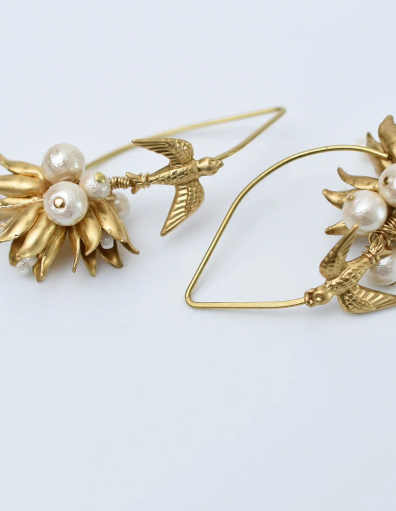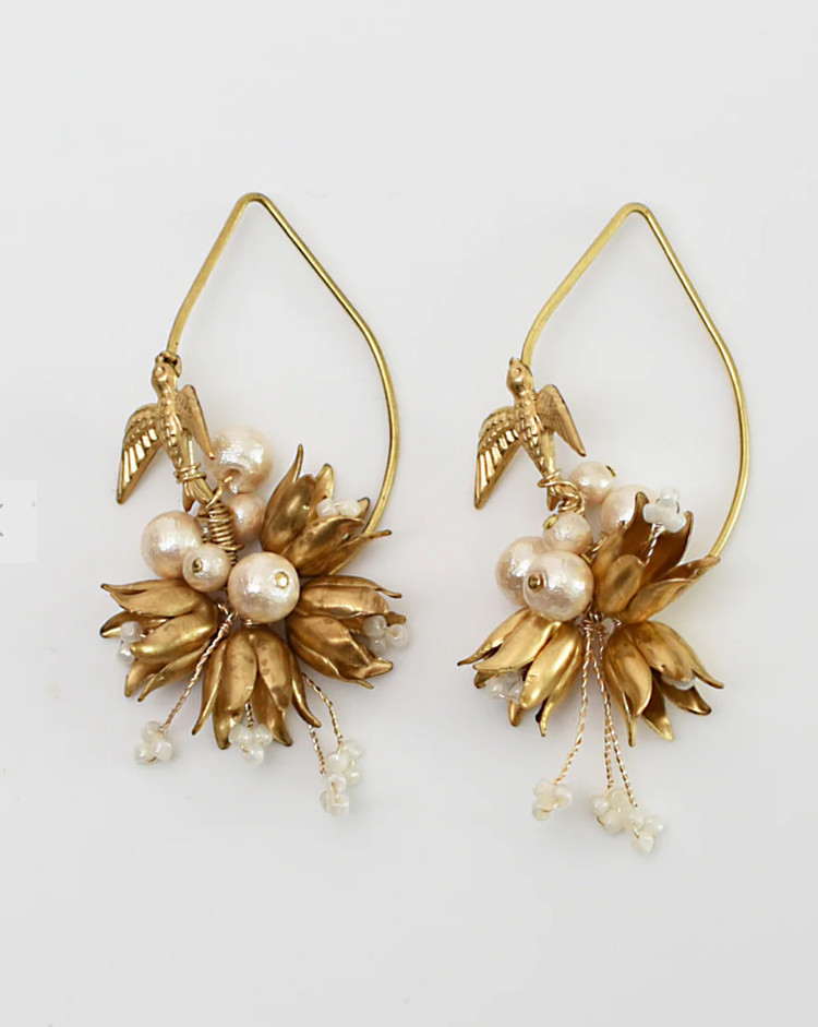 작은 진주와 플라워 모티브에 새가 멈춘, 어떤 복장에도 착용하기 쉬운 아름다운 귀걸이입니다..