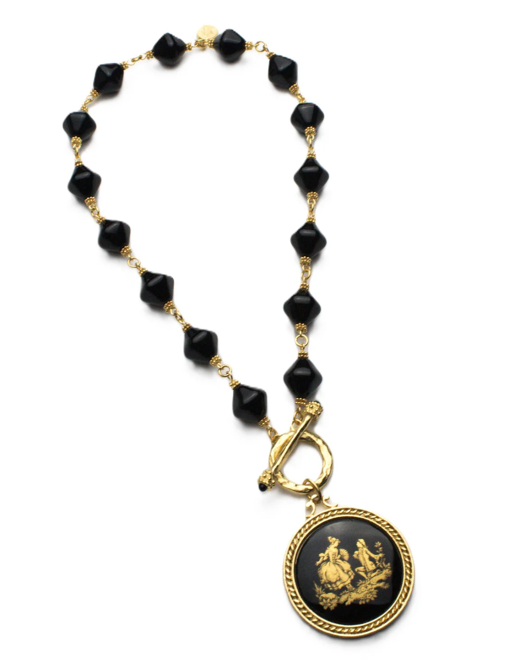 프론트 토글 목걸이는 15mm 유럽 제트 글라스 바이콘 비즈로 만들어졌습니다. 수공으로 연결된 비드 체인은 프랑스 화가 Jean-Honoré Fragonard 스타일의 로맨틱한 빈티지 제트/골드 유리 데칼 카보숑으로 세팅된 무광 골드 로프 테두리 펜던트를 현대적으로 해석 디자인되었습니다.