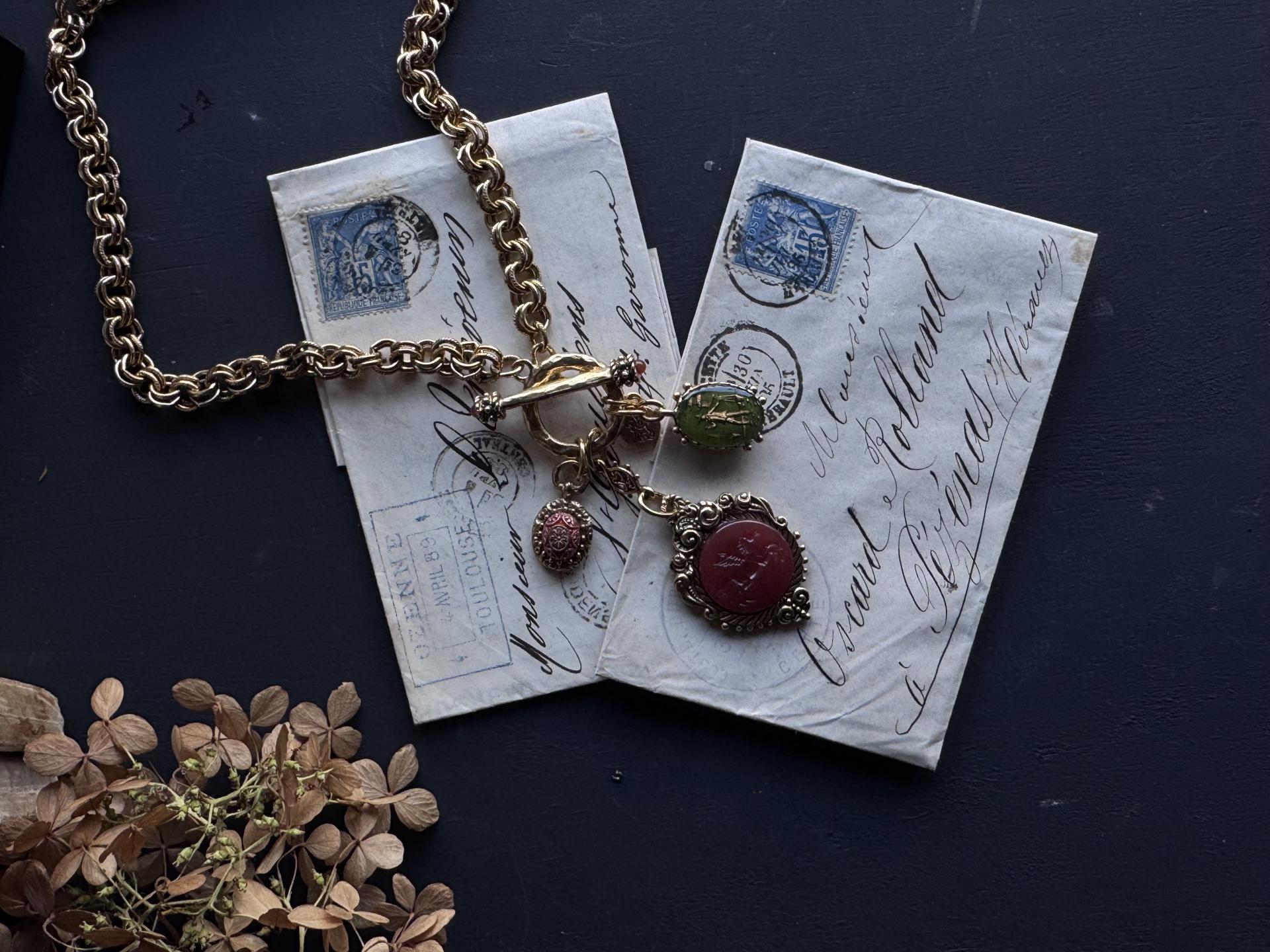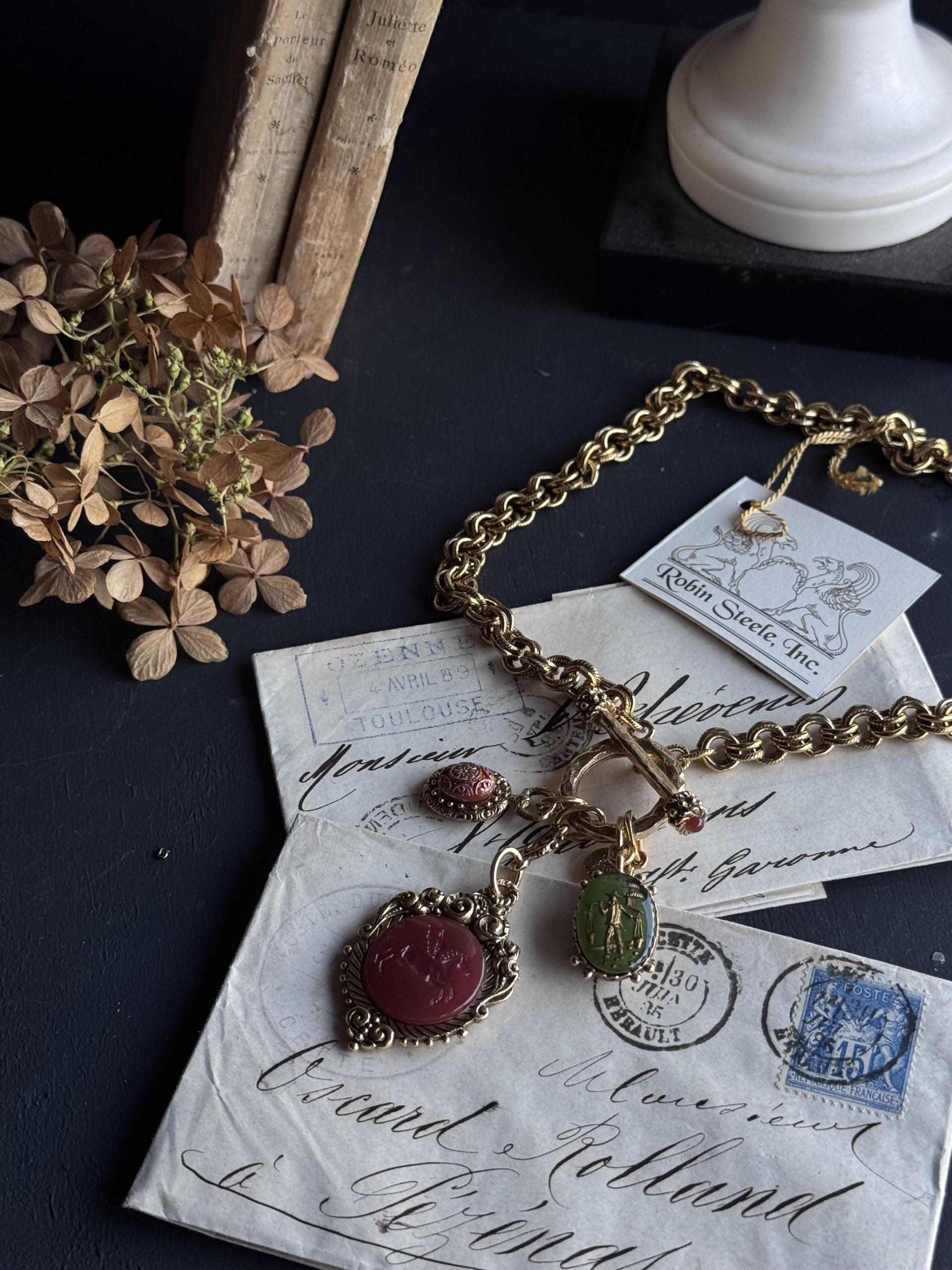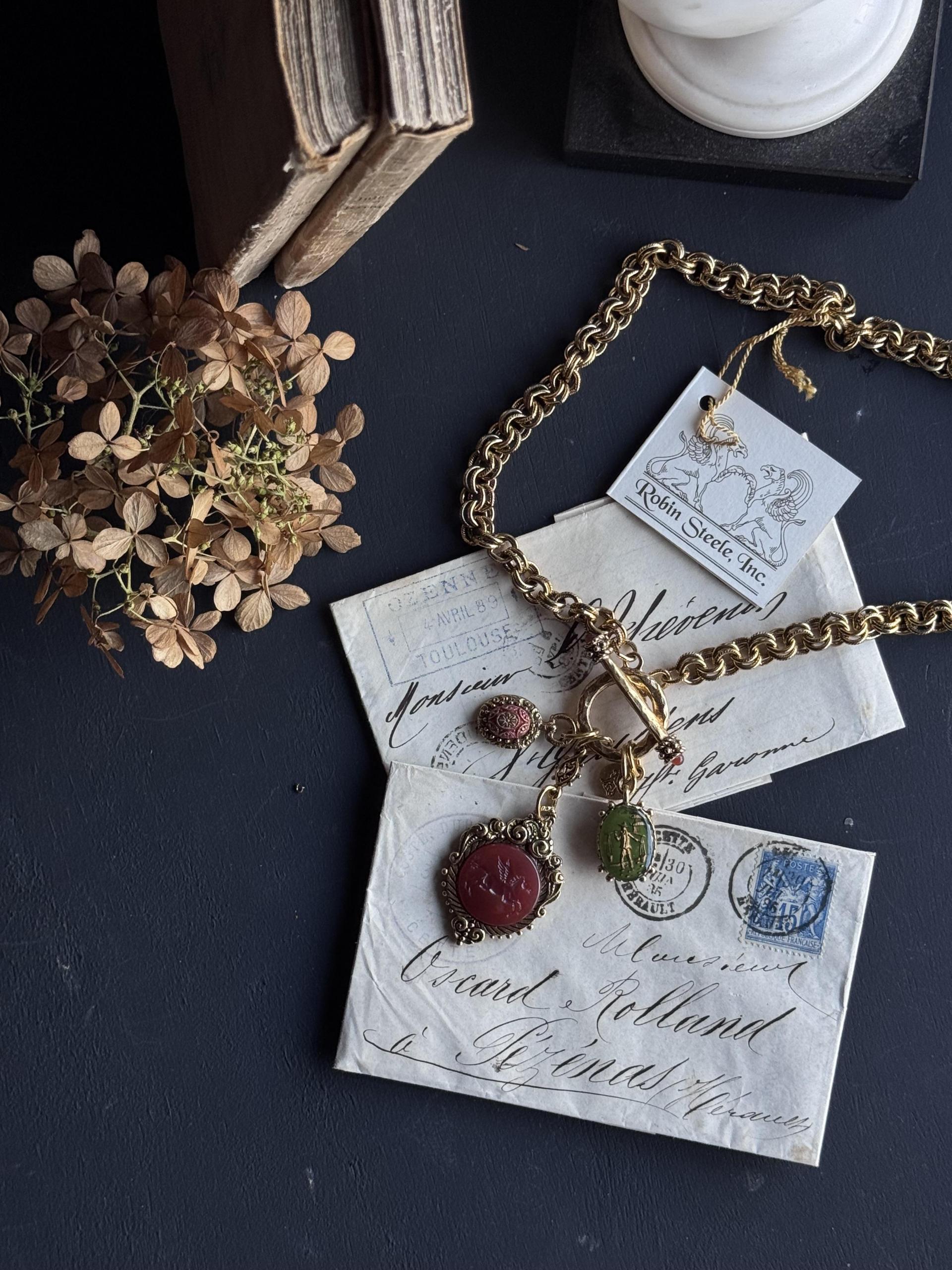 카넬리안과 올리브 그린의 풍부한 흙색의 세 가지 빈티지 보헤미안 유리 인태글리오가 우리의 디테일한 캐스트 포브 참에 세팅되어 있습니다. 18k 앤티크 골드로 도금한 빈티지 트위스트 더블 링크 체인은 이 풍부한 상징적 디자인에 또 다른 디테일 요소를 더합니다.