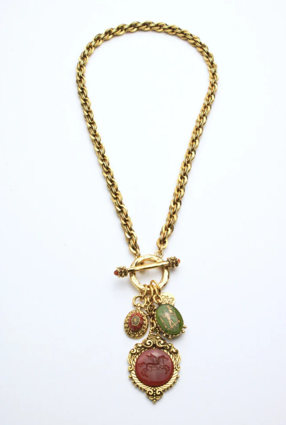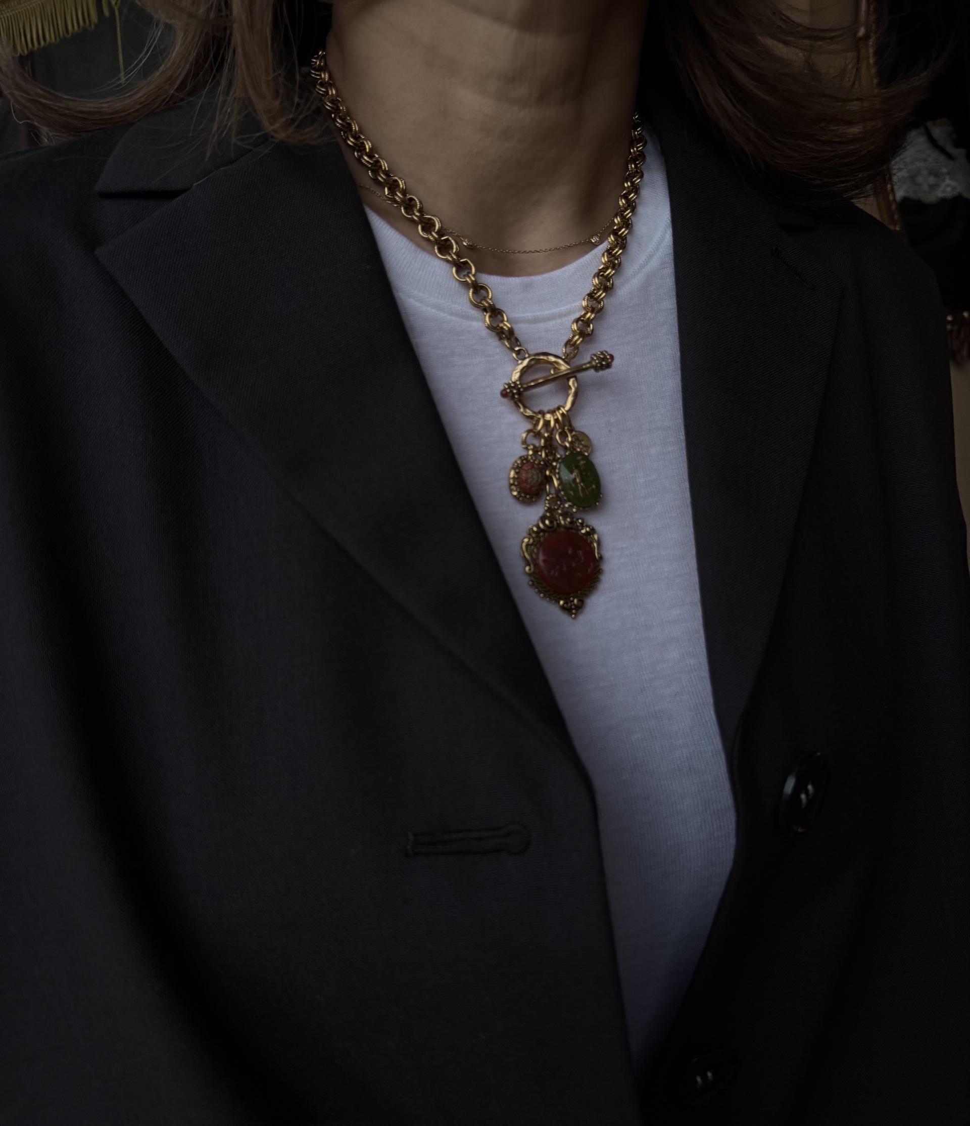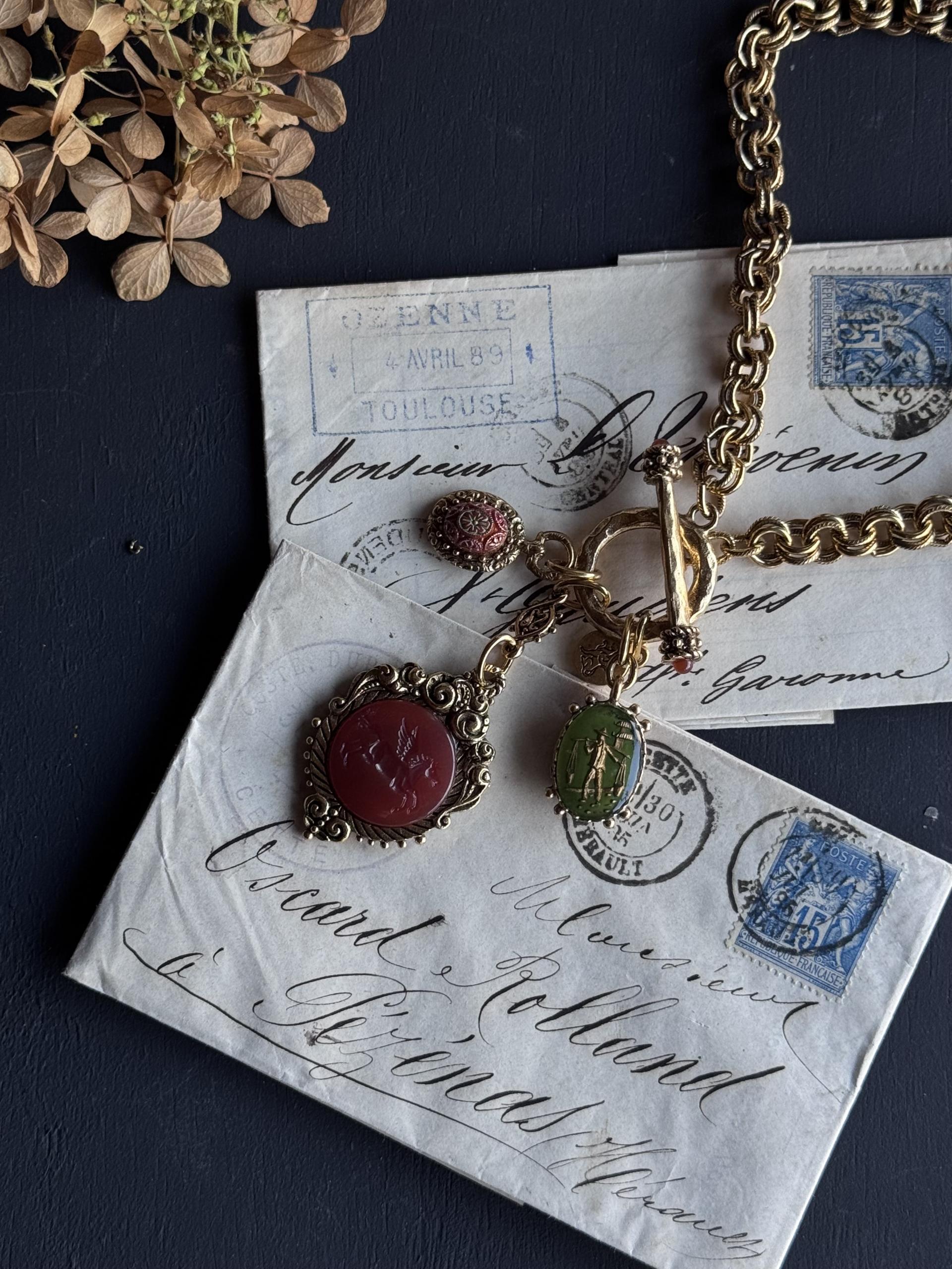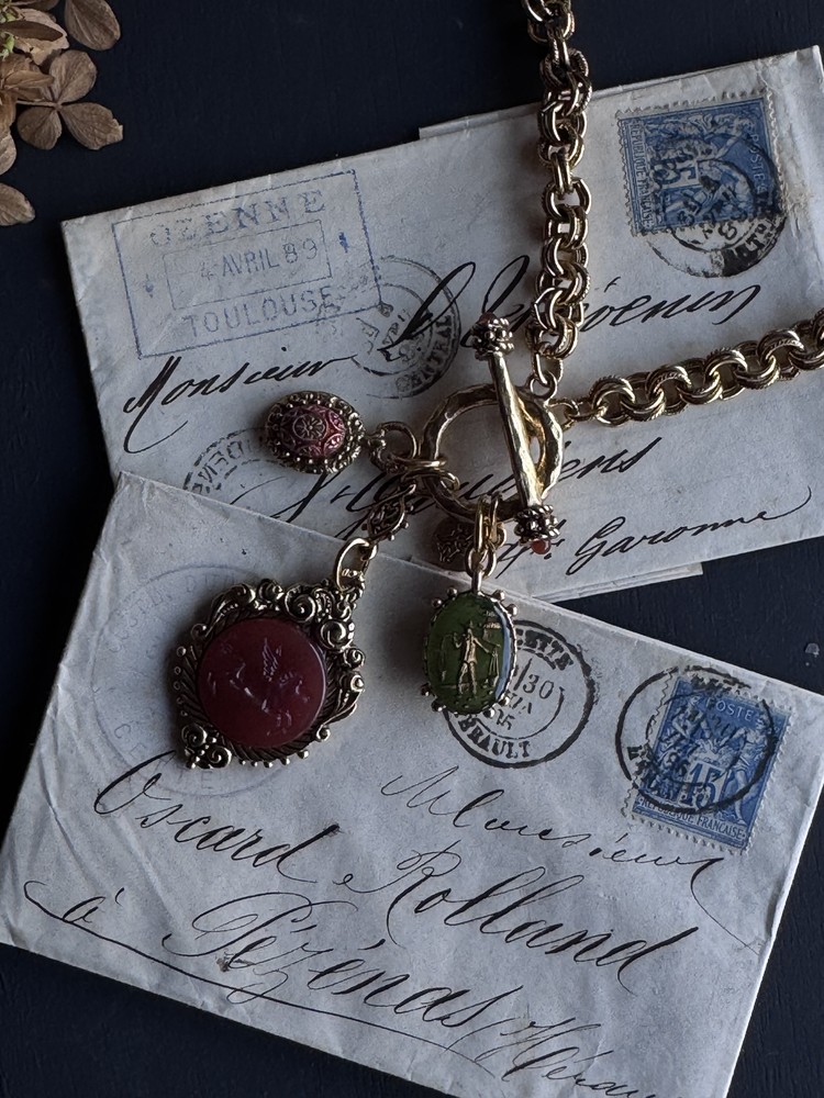 카넬리안과 올리브 그린의 풍부한 흙색의 세 가지 빈티지 보헤미안 유리 인태글리오가 우리의 디테일한 캐스트 포브 참에 세팅되어 있습니다. 18k 앤티크 골드로 도금한 빈티지 트위스트 더블 링크 체인은 이 풍부한 상징적 디자인에 또 다른 디테일 요소를 더합니다.